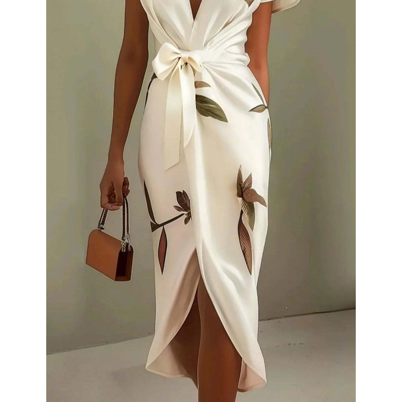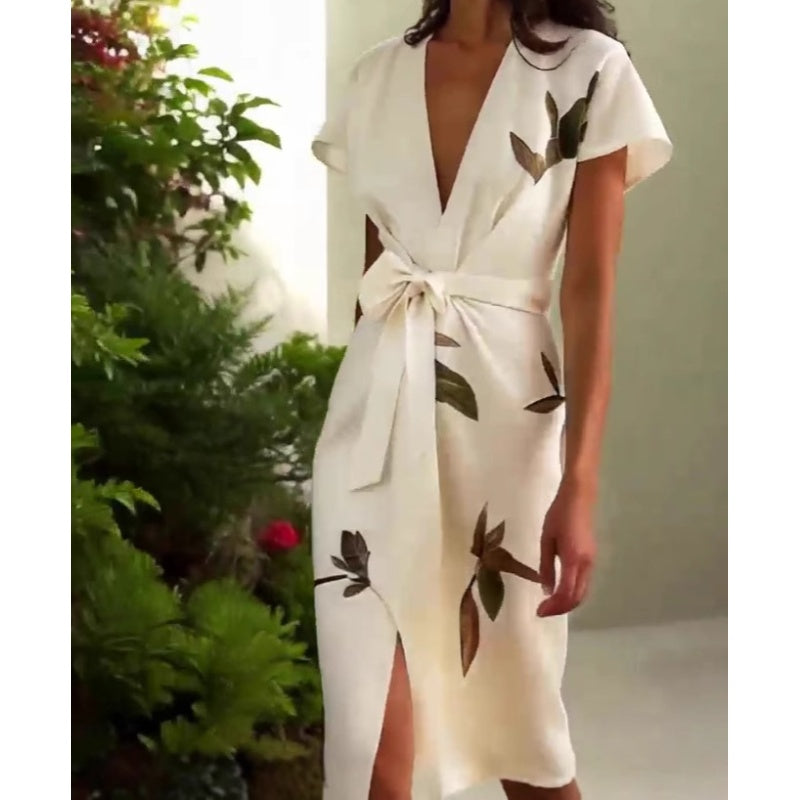 1 * Sukienka z nadrukiem z dekoltem w serek i paskiem w talii